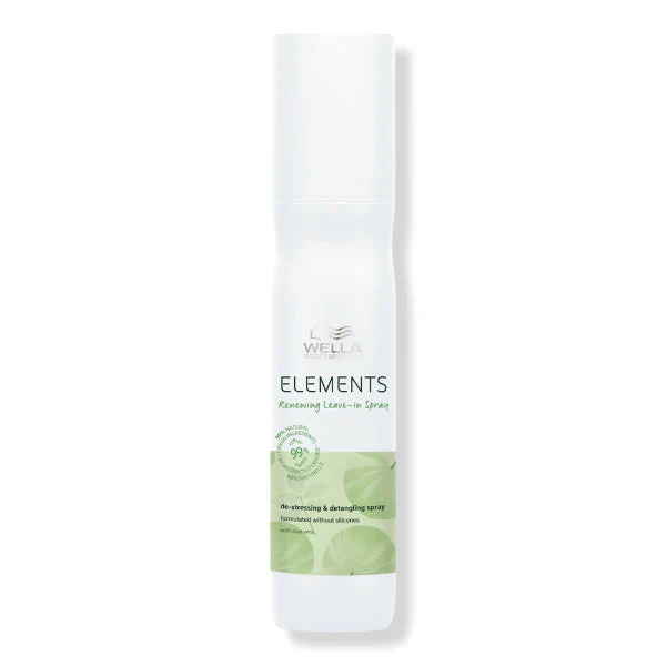 ELEMENTS leave in spray de Wella Professionals, protege el cabello del estrés mecánico diario y la rotura, hidrata, controla la estática y el frizz. Contiene 99% de ingredientes de origen natural. Aplicar de medios a puntas en cabello húmedo.